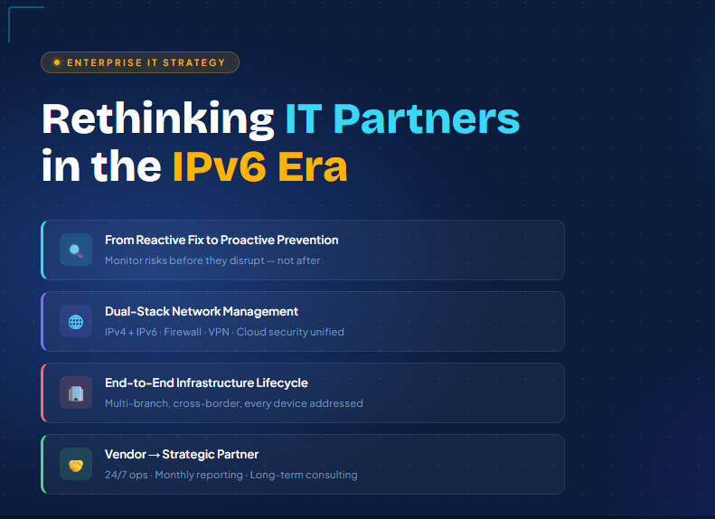 네트워크, 보안, 인터넷 서비스 제공 기업 또한 IPv6 시대에 맞추어 코어 네트워크 구조 재설계, 엣지 장비 업그레이드, IPv4·IPv6 통합 보안 정책 수립, 그리고 글로벌 클라우드 환경과의 호환성을 동시에 확보해야 합니다. 이러한 전환에 뒤처지는 기업은 신규 고객 확보는 물론, 기존 고객 유지에도 중대한 어려움을 겪을 가능성이 높습니다. 결국 IPv6 시대에서 IT 아웃소싱 기업의 경쟁력은 누가 더 빠르게 구축하느냐가 아니라, 누가 더 안정적으로 운영하고, 누가 더 효과적으로 리스크를 통제하며, 누가 더 장기적인 관점에서 고객과 동반 성장할 수 있는가에 의해 결정될 것입니다.