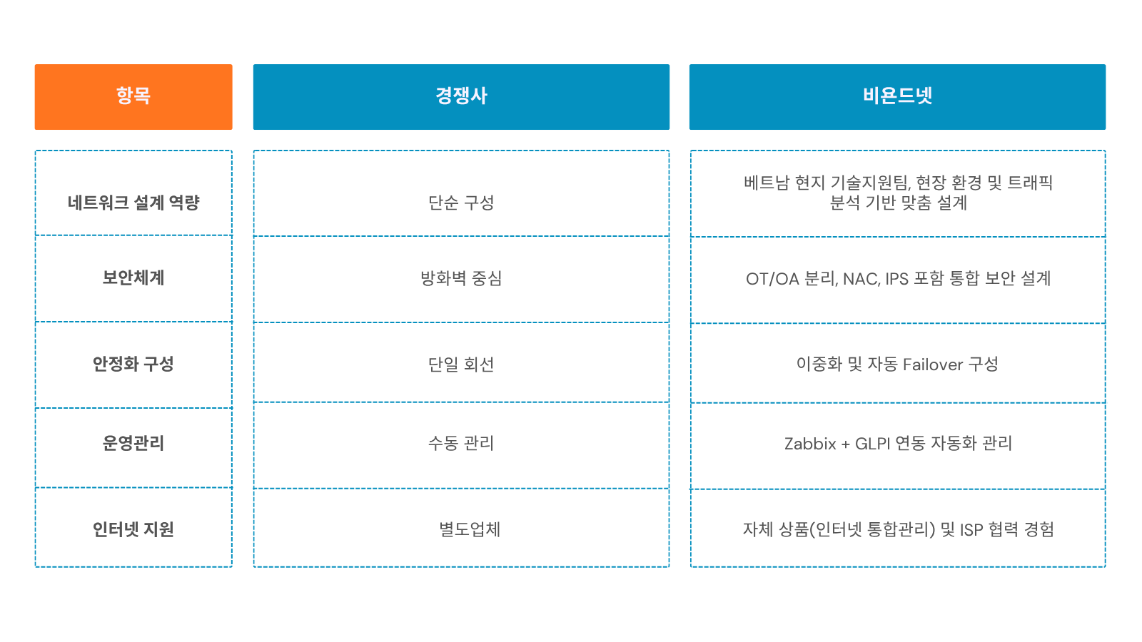 베트남에서 신규 설립되거나 확장 중인 한국 제조기업의 공장 인터넷을 포함한 네트워크 인프라 구축 및 유지보수 서비스를 제공합니다.